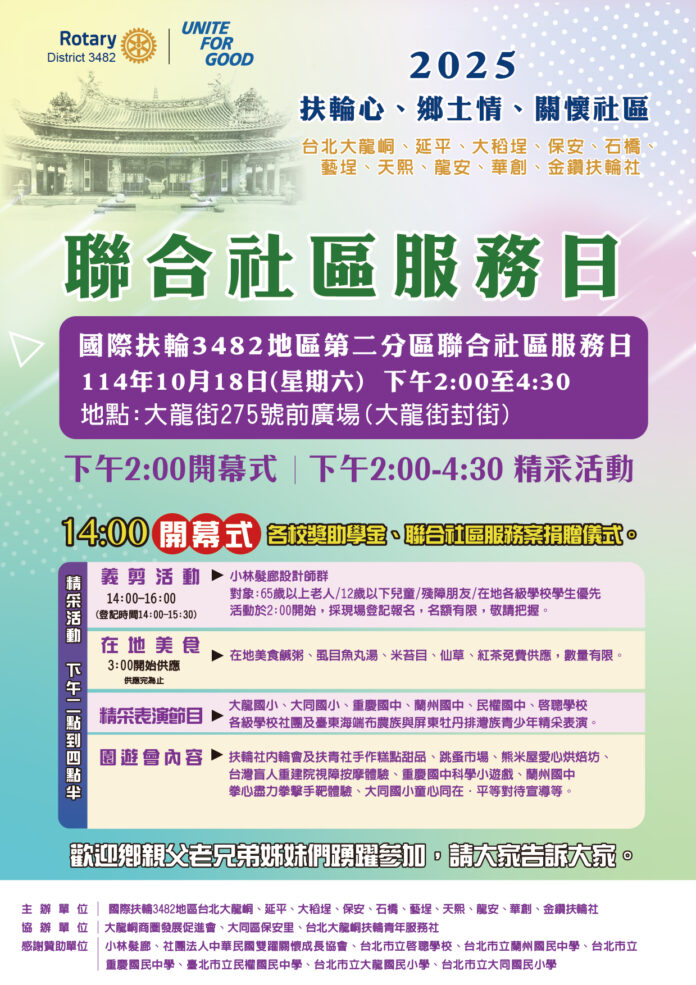 2025-10-18 國際扶輪3482地區第二分區聯合社區服務日By David Chuang - 2025 年 10 月 04 日0451 Calendar When: 2025 年 10 月 18 日 @ 14:00:00 – 16:30:002025-10-18T14:00:00+08:002025-10-18T16:30:00+08:00Where: 台北市大龍街275號前廣場(大龍街封街) 例會主題 社區服務 例會主題 社區服務
